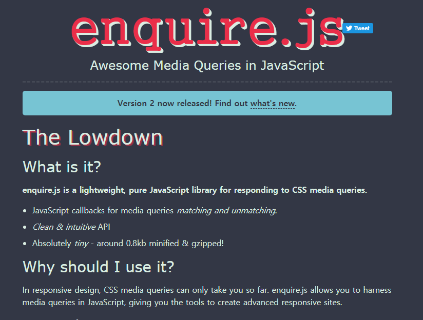 enquire.js는 CSS 미디어 쿼리에 응답하기위한 가볍고 순수한 JavaScript 라이브러리입니다.